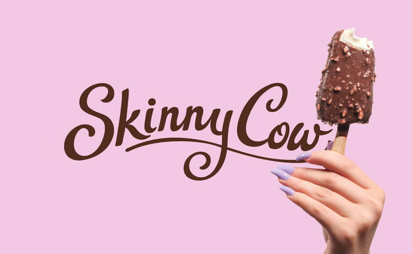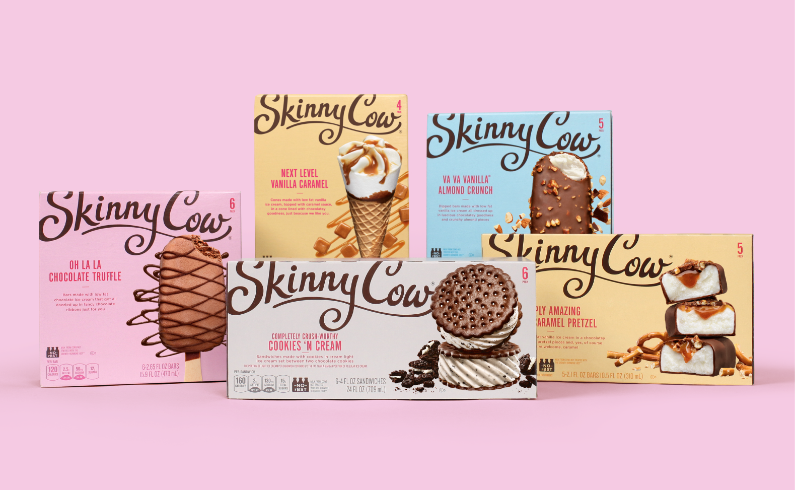 The previous SkinnyCow packaging felt outdated and lacked appetite appeal. The logo’s lock-up with the skinny cow girl felt limiting and didn’t reflect the indulgent, crave-worthy nature of the product. As a low-calorie frozen dessert brand, SkinnyCow needed to move beyond dated visuals and better express its promise of guilt-free indulgence.